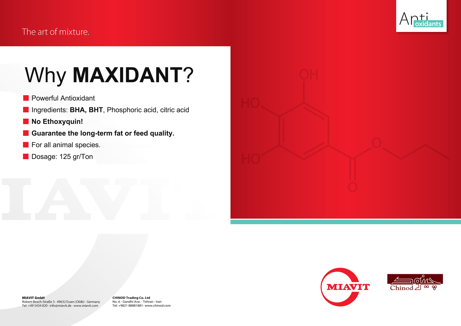 The Maxidant range is particularly developed to act as a synergistic combination of anti-oxidants and chelators for the stabilization of feeds, premixes and concentrates. This range is especially developed for products that are very susceptible to oxidation, mostly because they have a high content in highly unsaturated fatty acids.